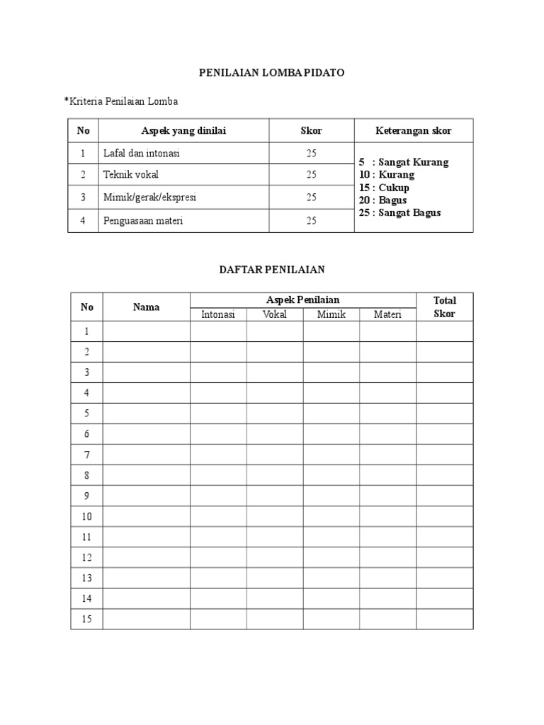 See full list on handy.my.id 04012021 download contoh form blangko nilai penilaian ujian dan lomba tahsin dalam format doc ms word unduh gratis beserta aturan dan ketentuan perlombaan guna mendapatkan hasil terbaik juara. See full list on handy.my.id No penampila penguasaa gaya expresi time skor n n materi berpidato wajah nilai juri 1 j u r i ii aminah yusuf, s.pd. Peserta lomba akan dinilai oleh dewan hakim terdiri dari empat kategori yaitu.